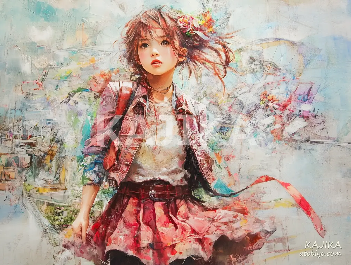 赤い服装のちょっと活発そうな少女です。ちょっとランドセルっぽいカバンをせおってます